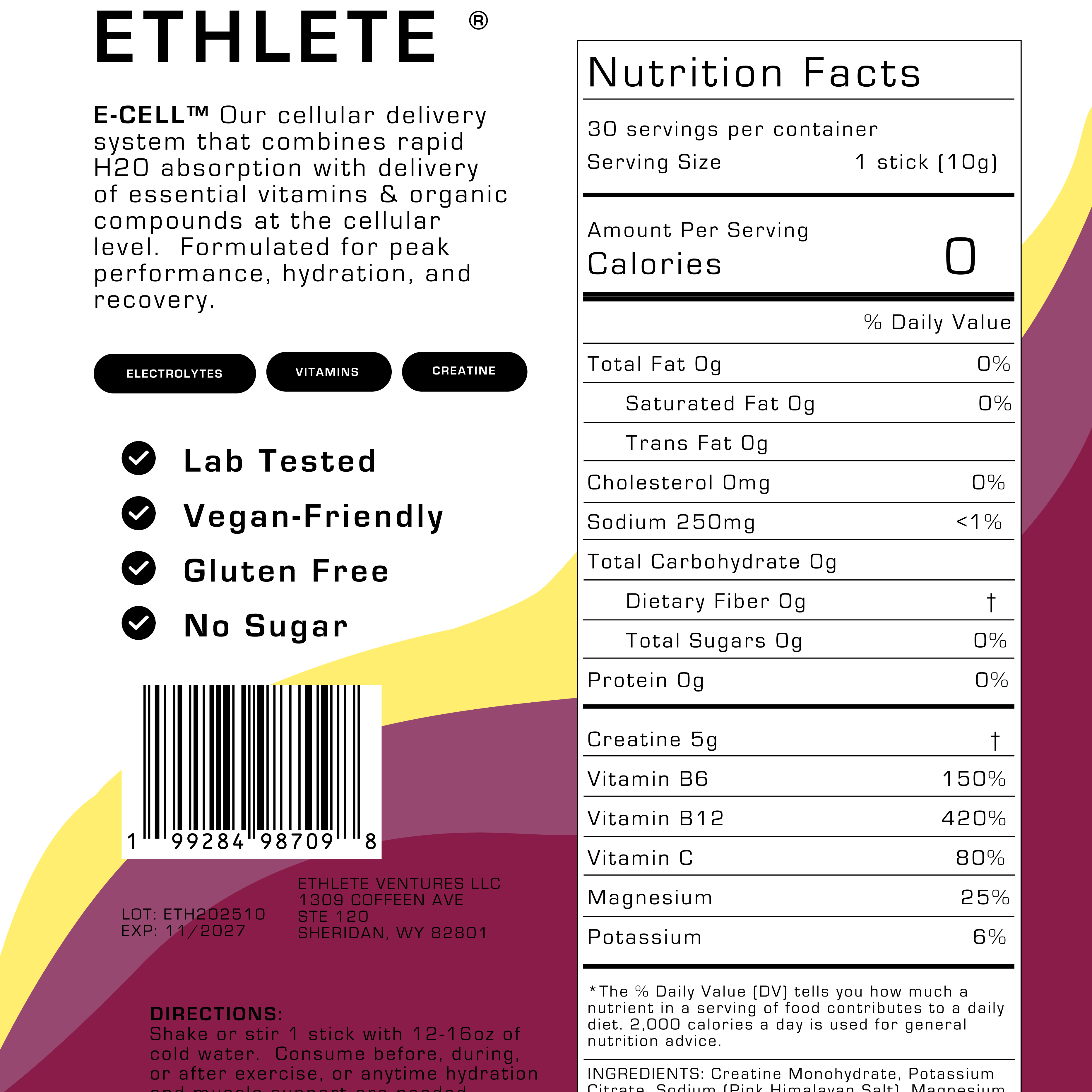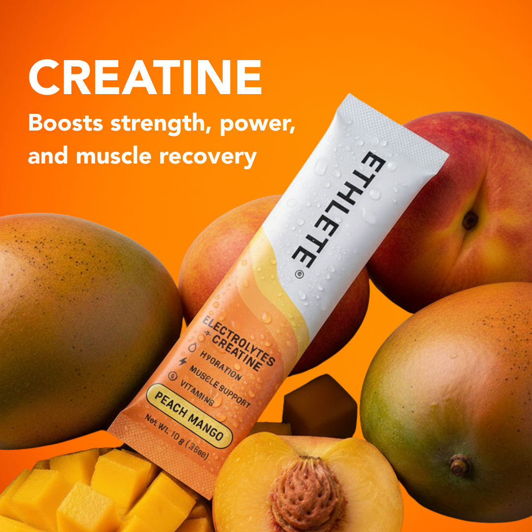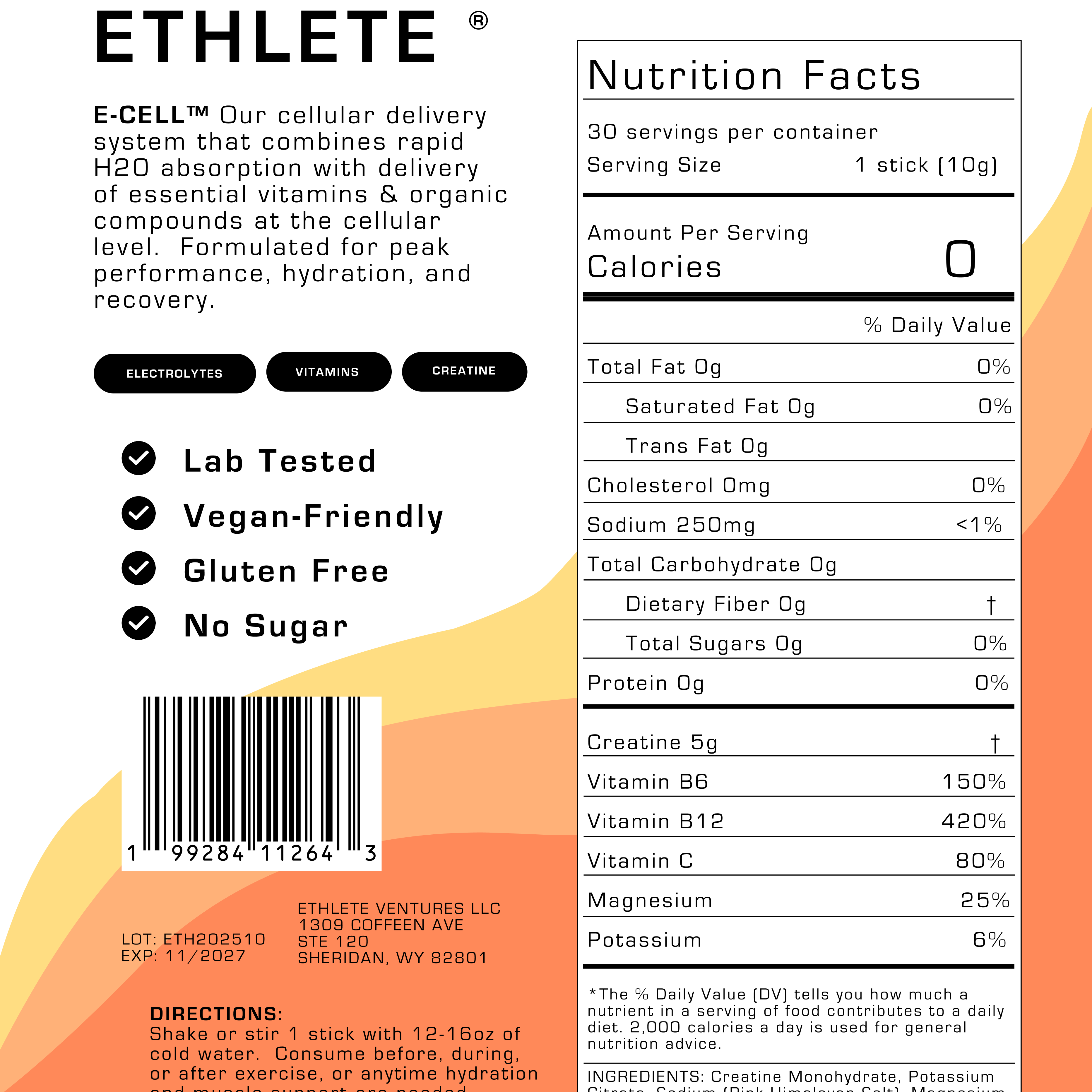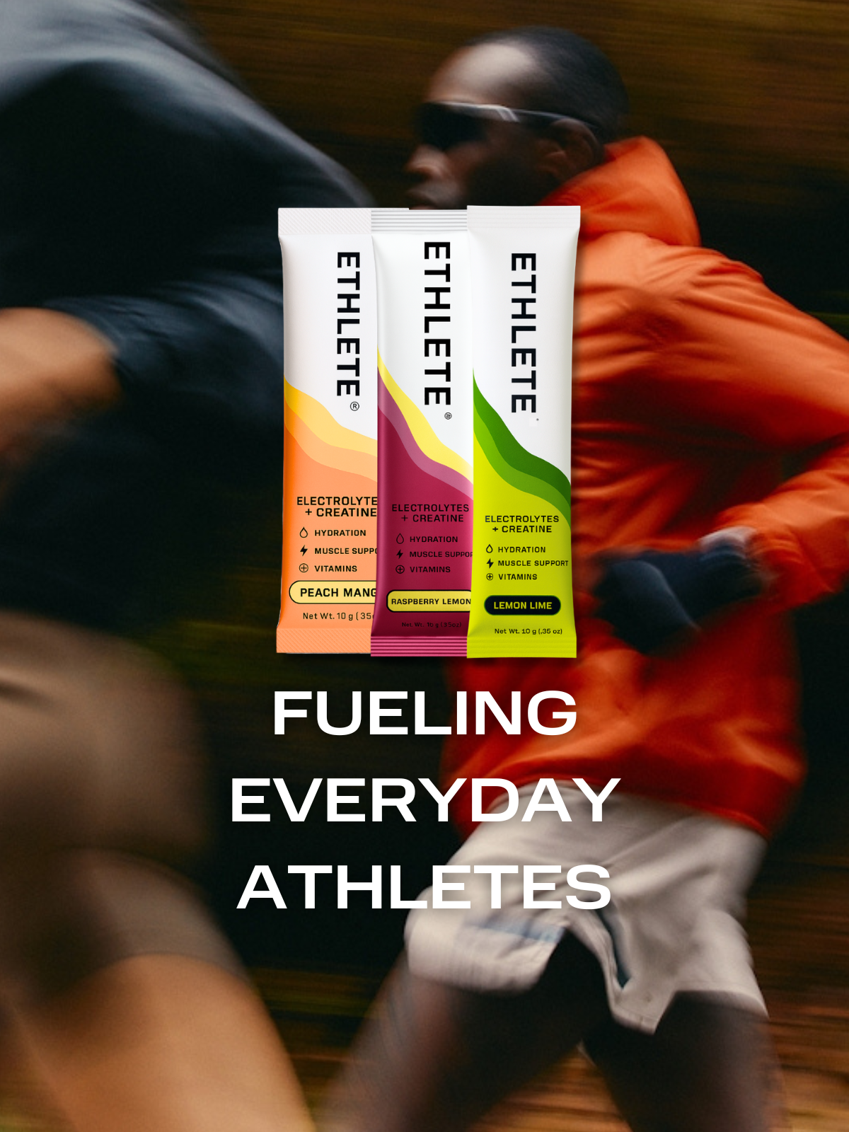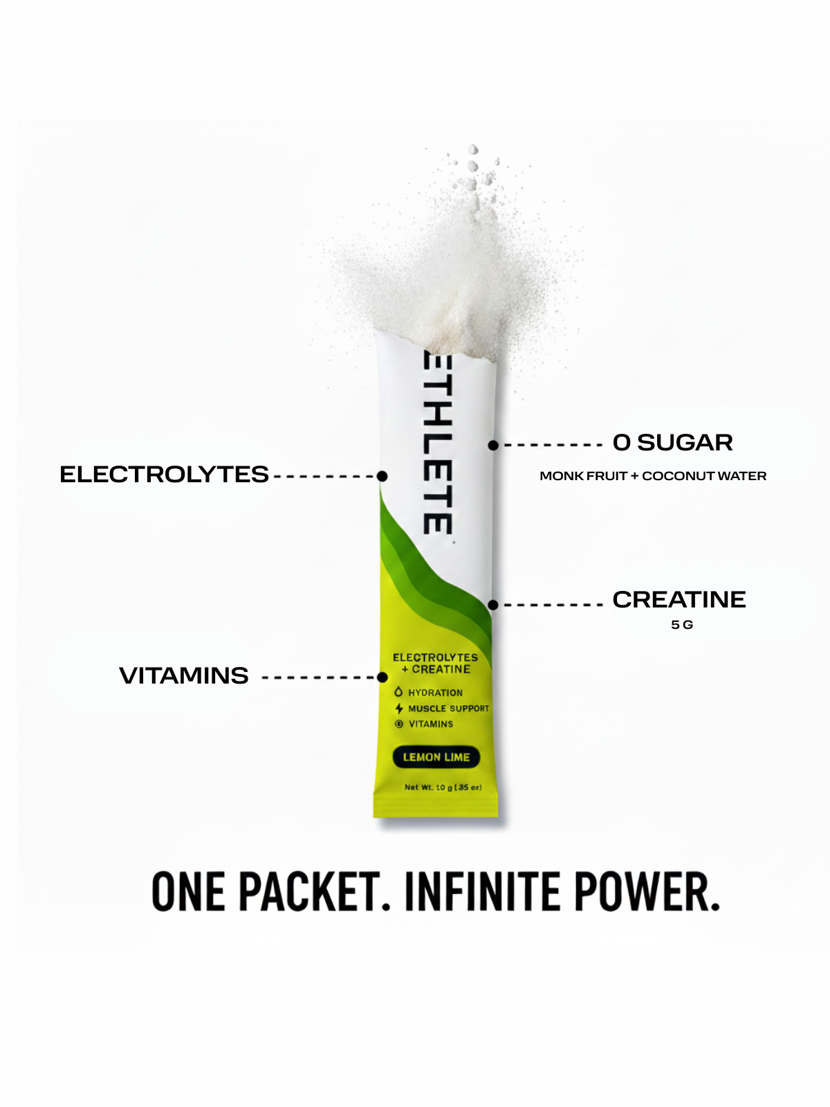 ETHLETE was formulated with Ivy-League scientists to fuel performance. Each stick combines clinical doses of electrolytes, creatine, and essential vitamins (B6, B12, C) with zero artificial colors or fillers to deliver hydration that supports muscle recovery, mental focus, and cellular hydration.