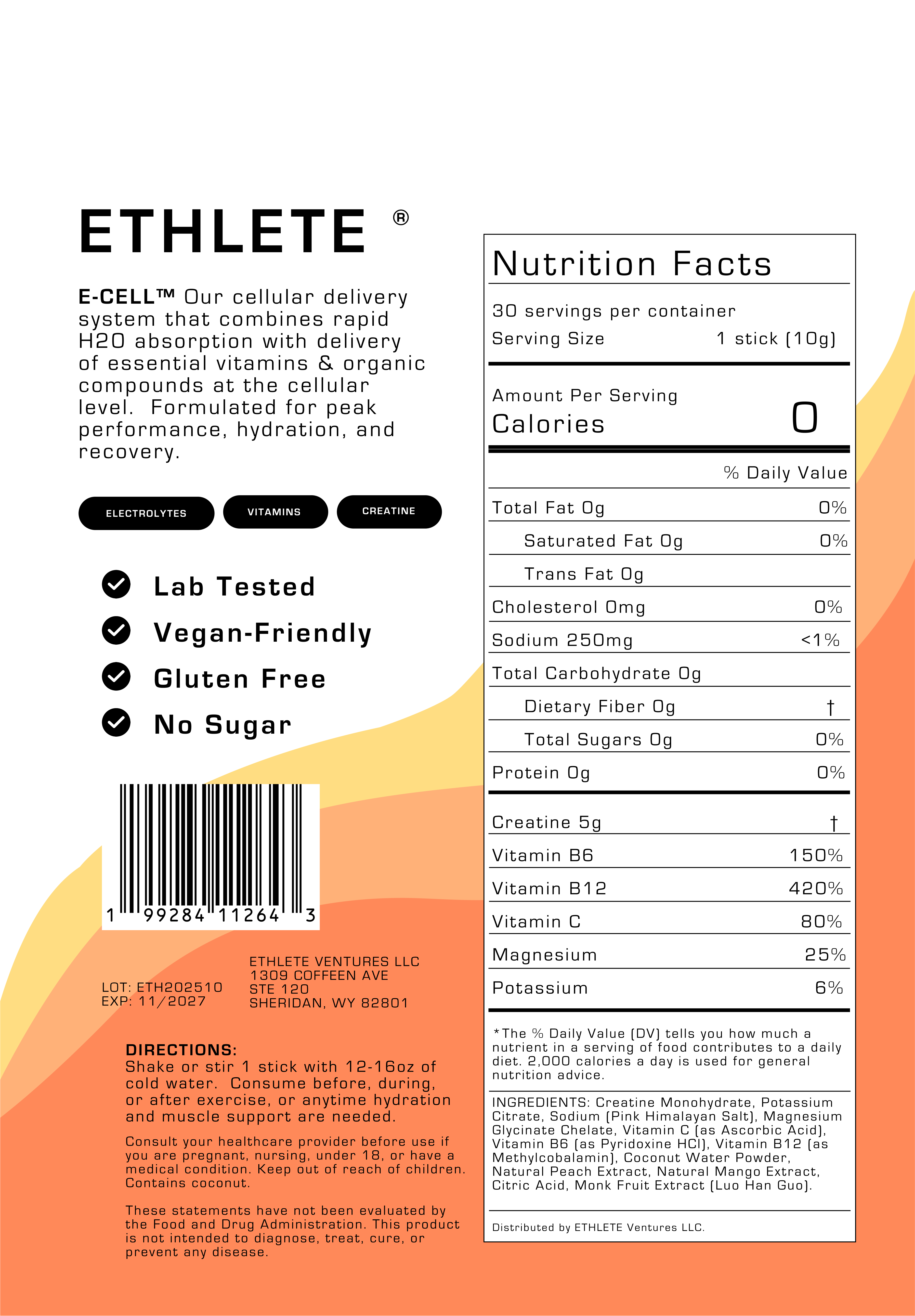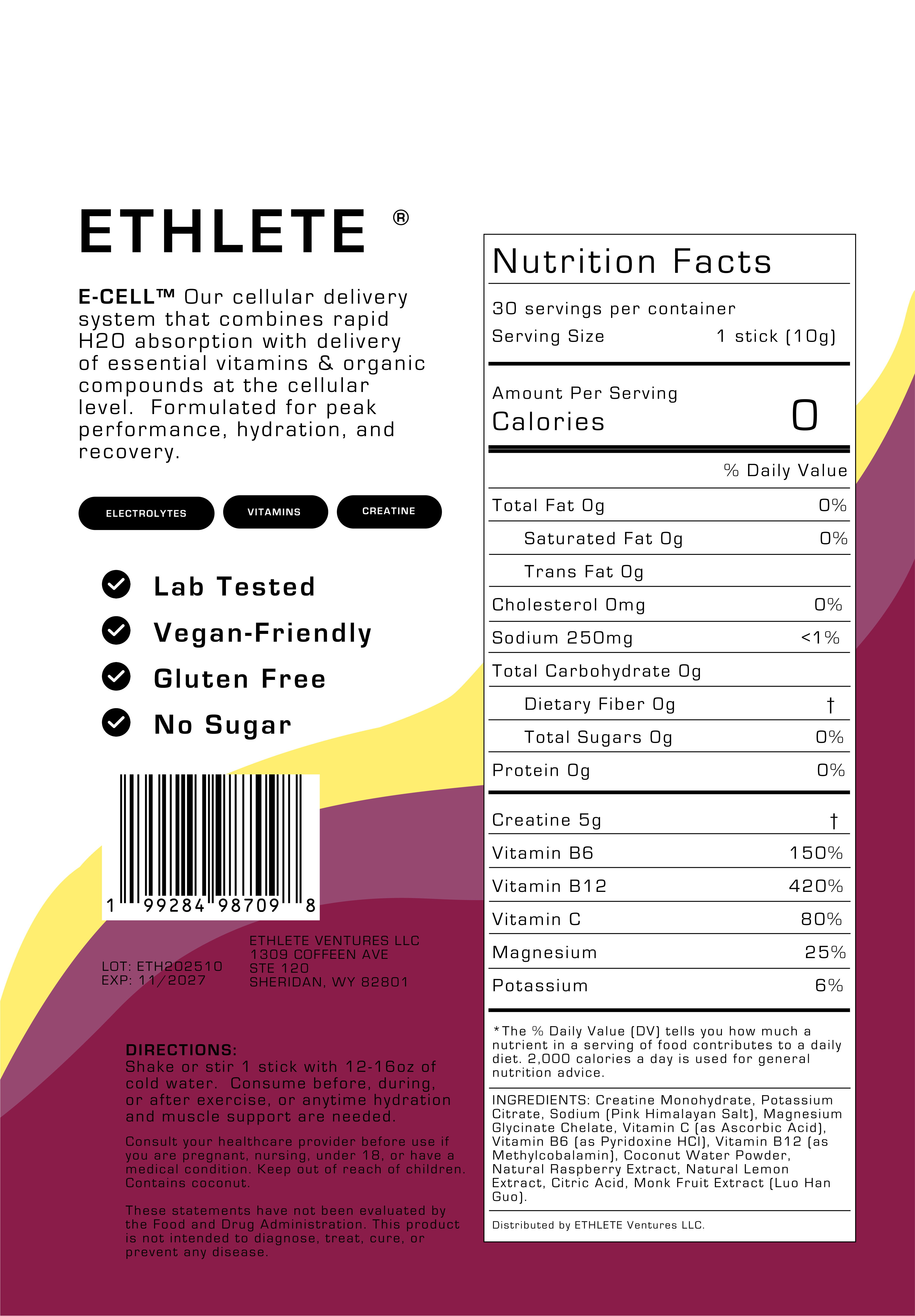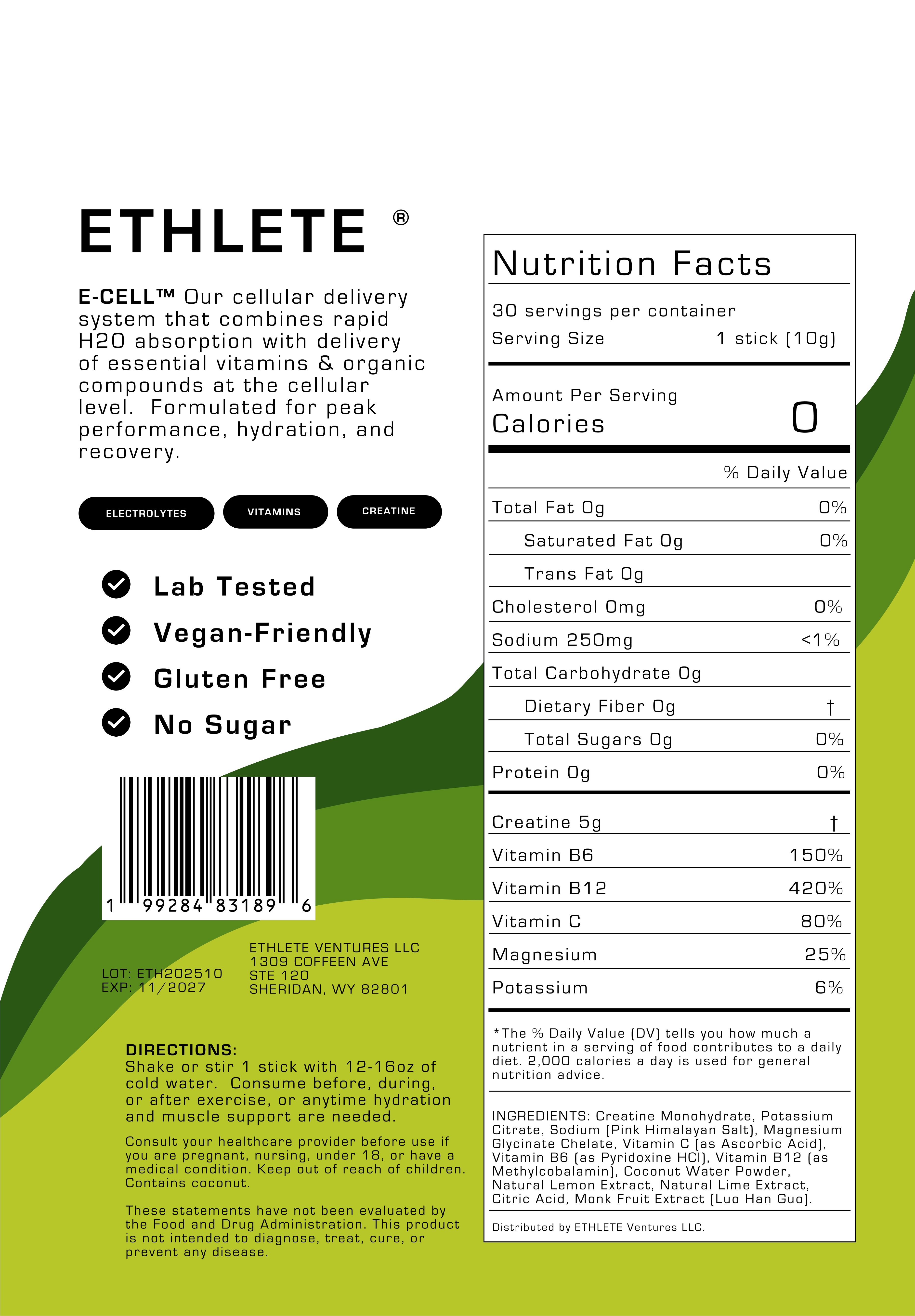 E-CELL™ Our cellular delivery system that combines rapid H20 absorption with delivery of essential vitamins & organic compounds at the cellular level. Formulated for peak performance, hydration, and recovery.